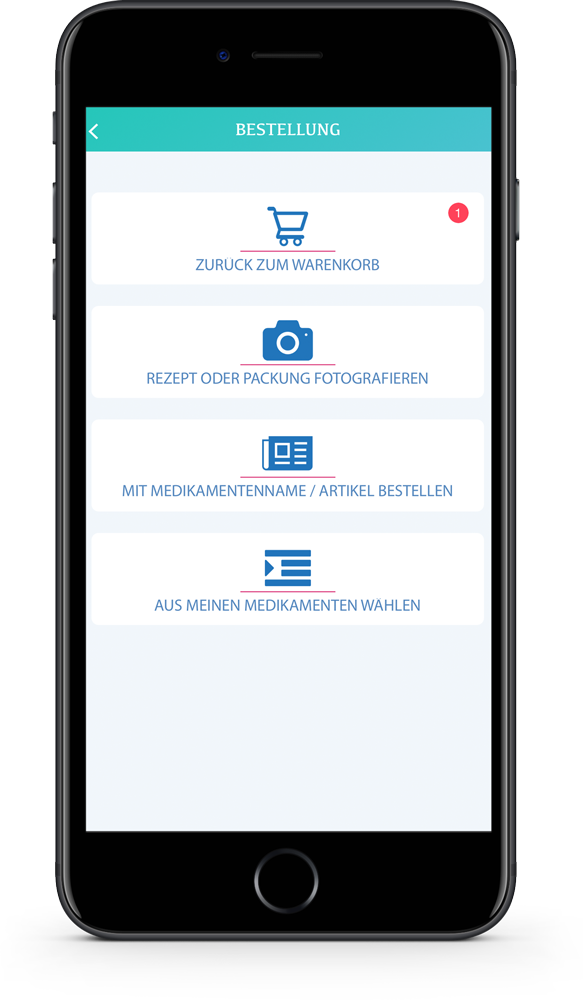 Unter "Bestellung" stehen Ihnen verschiedene Möglichkeiten zur Verfügung. Bitte beachten Sie, dass Sie für Fotos den Zugriff der App auf die Kamera aktivieren.