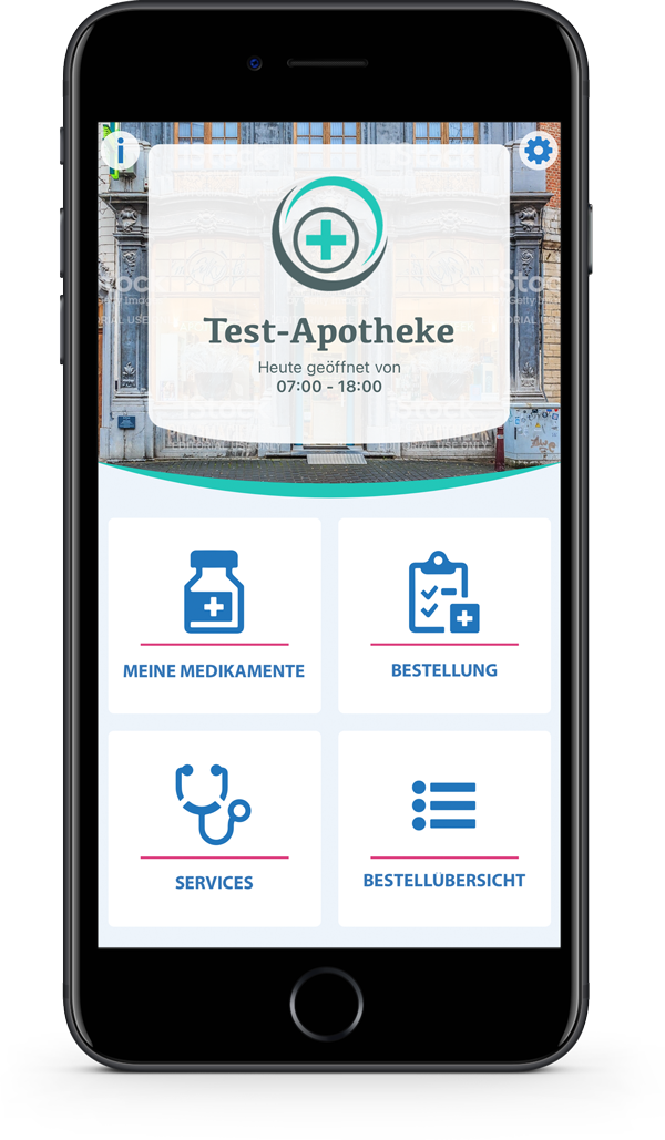 Auf der Startseite stehen Ihnen verschiedene Funktionen zur Verfügung. Ob eine mittlere Schaltfläche sichtbar ist, ist von Ihrer Apotheke abhängig.
